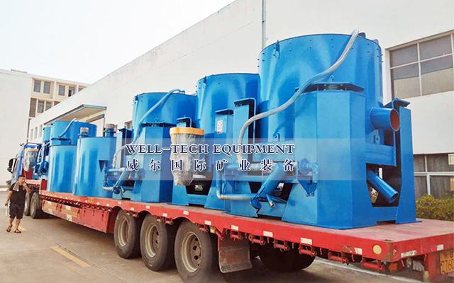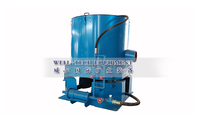 離心機是目前最新的一種重選設備,該設備的原理是利用離心力來擴大礦物顆粒的重力來使重顆粒和輕顆粒分離。其關鍵的部件是一個錐形的富集錐,它由電機帶動高速旋轉并由加壓的反沖水包圍。進入離心機分選的物質通常是球磨機研磨過的礦物或者水力旋流器的溢流礦漿, 礦漿從富集錐的上端被注入到富集錐的底部,富集錐的內部有一排排肋狀物形成的凹槽,富集錐旋轉產生的離心力會將礦物甩向凹槽,但由于凹槽中的向外噴射的反沖水的作用,只有重礦物顆粒能克服反沖水的阻力一直停留在凹槽內形成精礦,輕礦物因受到的離心力較小,難以克服反沖水的作用,則被反沖水沖出凹槽并在不斷注入的水流的帶動下從富集錐上端溢流出來從而成為尾礦。