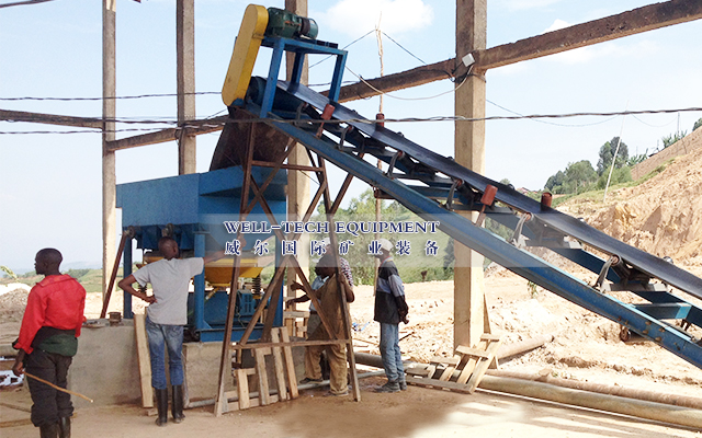 黑鎢礦重選通常采用多級跳汰、多級搖床、中礦再磨的重選流程。即細碎后合格礦經過振動篩分級后進行多級跳汰,產出跳汰重選毛砂,粗粒級跳汰尾礦進入磨機再磨,細粒級跳汰尾砂經過分級機后進入多級搖床選別,產出搖床重選毛砂,搖床尾礦排入尾礦庫,搖床中礦返回再磨再選,跳汰和搖床的重選毛砂進入精選作業。