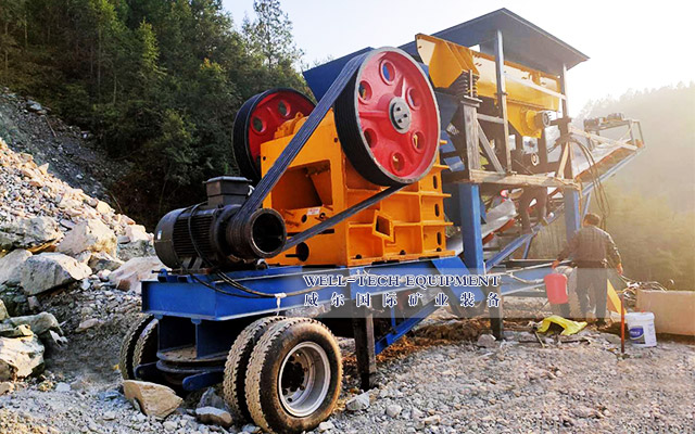式破碎機破碎礦石的過程,加入到顎式破碎機破碎腔(由固定顎板和可動顎板組成的空間)中的物料,由于動顎板作周期性往復擺動,當動顎板靠近固定顎板時,物料受到壓碎、劈裂和彎曲折斷的作用而被破碎。當動顎板離開固定顎板時,已碎到小于排礦口尺寸的物料,靠其自重從下部排礦口排出。位于破碎腔上部還未破碎到足夠小的物料,隨之下落到破碎腔的下部,再次受到顎板的作用而繼續被破碎。