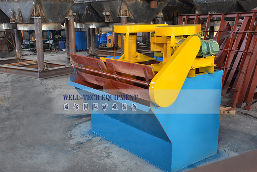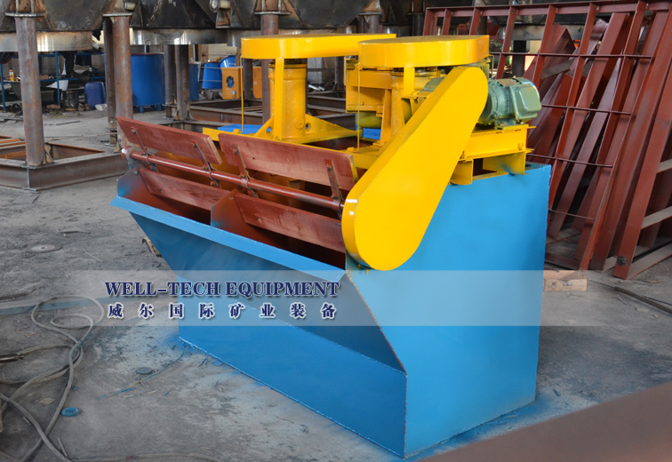 XJK型自吸氣式浮選機的工作原理:電動機通過三角皮帶、皮帶輪使葉輪轉動,一方面吸入足夠的空氣和礦漿混合,一方面攪拌礦漿與藥劑混合,同時細化氣泡,顆粒在藥劑的作用下,粘附在氣泡上,浮到礦漿表面,形成礦化泡沫層,被刮板刮出。