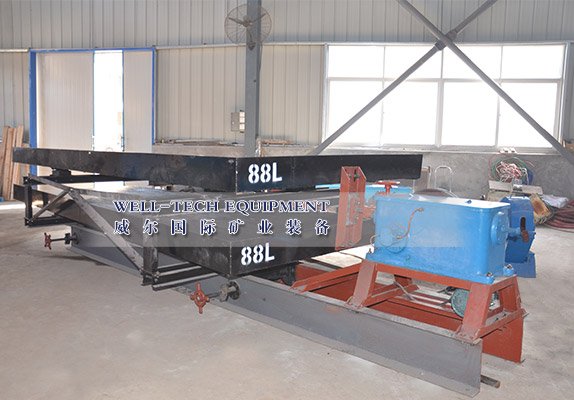 二、產(chǎn)品結構及材質: 6-S雙層搖床采用與6-S大槽鋼支架搖床相同形式底座,兩基腳放置于大槽鋼底座上,大槽鋼鋼板上升高焊接槽鋼支架用于放置搖床頭,搖床面采用在6-S單 層搖床床面上增加上一塊尺寸與原有床面相同的床面,上下兩層用鋼板連接支撐,它們的間距400毫米,自由空間約300毫米。床頭仍采用雙曲柄搖桿機構, 彈簧盒在搖動箱外,曲軸、拉桿、彈簧、搖桿等部件都相應加大了尺寸,材質更加規(guī)范。床面為玻璃鋼床面,上下層尺寸均為1823×1558×4520毫米。 上下層床面共用下層床面的一套調坡裝置,采用搖動肘板支承。其調整座板和基座的旋轉弧線半徑增大至545毫米,以適應圓弧支點轉動圓心與牽引螺絲中心在同 一直線上。