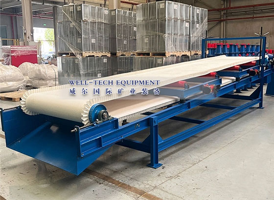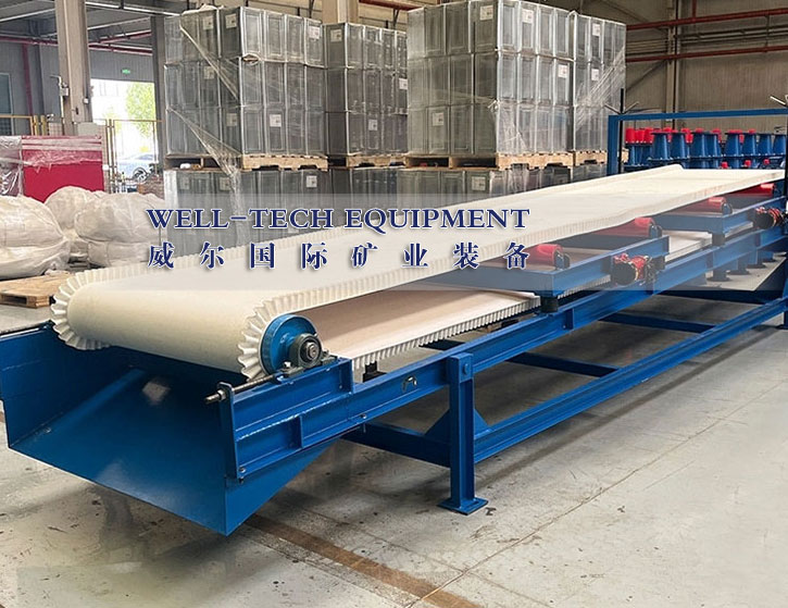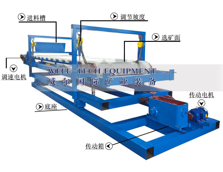 毛毯機(懸振式毛毯機)又稱布溝機,是一種比較獨特的重選設備,懸振毛毯機是在傳統毛毯機上增加了往復運動傳動裝置,相比傳統布溝機對微細顆粒物料的回收更為有效,解決了床層板結問題,使重礦物更容易分層、沉降,大大提升了回收效率。特別適用于 80 目以上鎢、錫、金、銅 、鉛、鋅、鉻、鈦、鋯、稀土、金紅石、獨居石、鉭鈮、石榴石、石英高嶺土等產品的回收與再提純,還可用于選礦廠超標尾砂、廢棄尾礦的再提取利用,同時也可用于磁鐵礦、次黃鐵礦和焙燒后的赤鐵礦、褐鐵礦、菱鐵礦里的鎢、錫、銅等稀有金屬的回收。