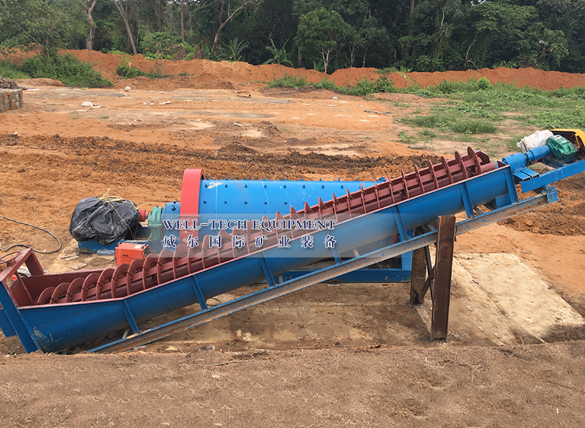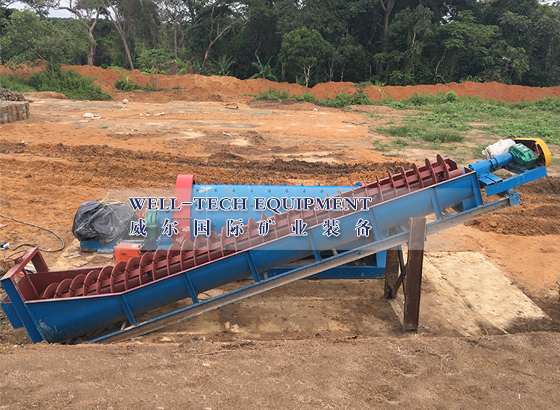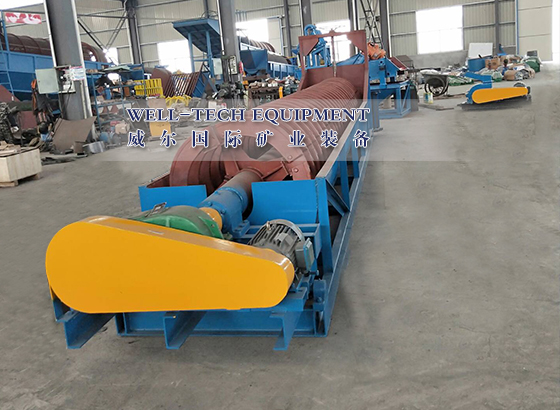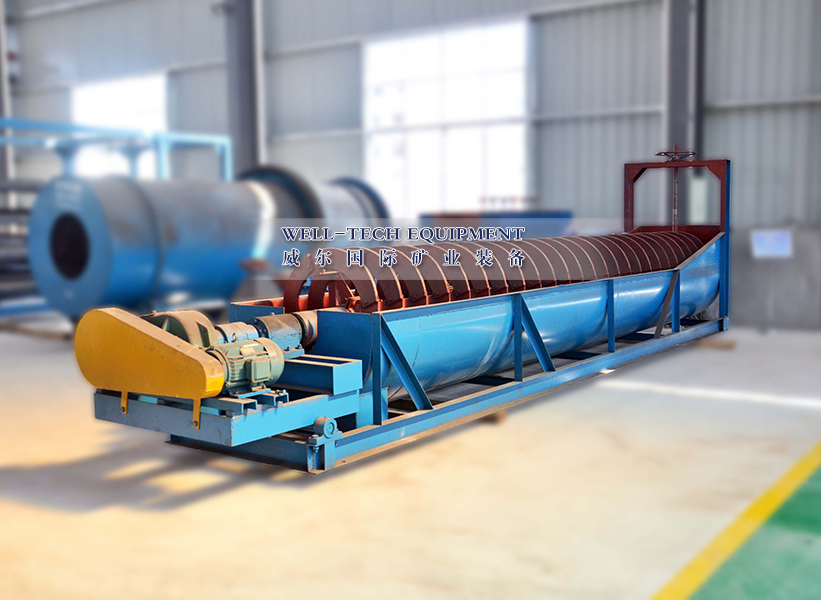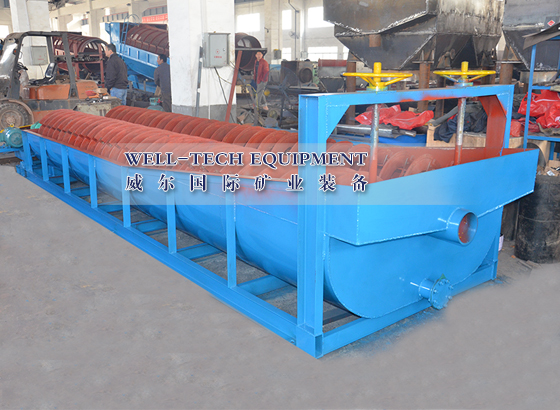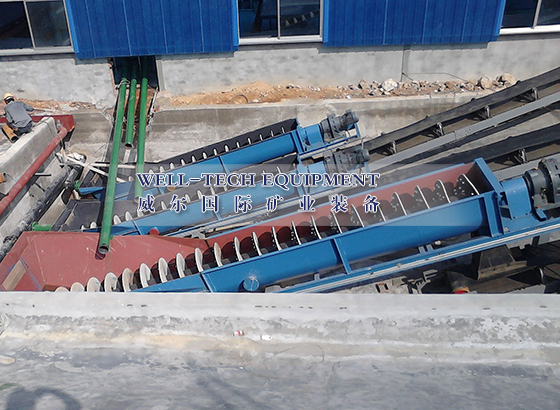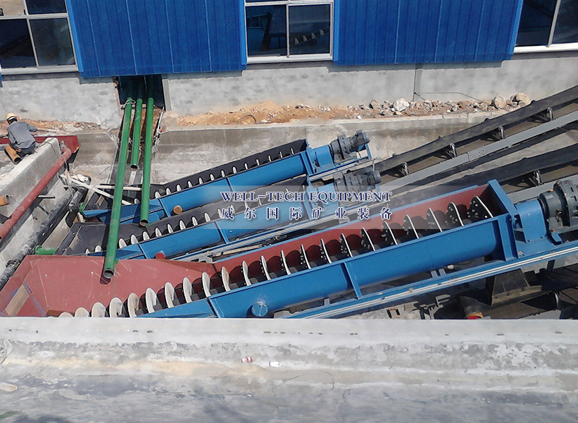 螺旋分級機在選礦廠用于同磨礦機組成閉路工作的分級機,需要有提升運輸沉砂的機構,因此這類分級機被稱為機械分級機,其實分級過程仍是借顆粒的沉降速度不同進行的。機械分級機除主要作為磨礦的輔助設備進行預先分級和檢查分級外,有時也用于對含黏土礦石進行洗礦以及對礦將進行脫泥、脫水。 根據運輸沉砂機械的形式不同,機械分級機可分為螺旋分級機、耙式分級機和浮槽分級機等。其中螺旋分級機構造簡單,操作方便,分級槽具有較大的傾斜角度,便于同磨礦機作自流連接,故應用較普遍。其他形式的分級機雖在我國仍有使用,但已停止制造。螺旋分級機的外形是一個矩形斜槽,槽底傾角為12°~18.5°,底部呈半圓形。槽內安裝有1或2個縱長的軸,沿軸長連續地安置螺旋形葉片。借上端傳動機構帶動螺旋軸旋轉。如為雙螺旋,從上部來看螺旋葉片均是向外轉動。礦漿由槽的旁側給入。在槽的下部形成沉降分級面。粗顆粒沉到槽底然后被螺旋推向上方排出,在運輸過程中并進行脫水。未及沉降的細顆被表層礦漿流攜帶經溢堰排出。分級過程與在分泥斗中基本相同。在分級槽下端有一個框架??蚣艿纳喜繖M梁設有提升裝置,用以調節螺旋葉片距槽底的距離,并在停車時將螺旋軸抬起,以防止礦砂沉積埋住螺旋葉片。 螺旋分級機分級液面的高低又可分為高堰式和浸入式(或稱沉沒式)兩種。高堰式分級機的溢流堰高于下端螺旋軸的中心,而低于螺旋葉片的上緣。分級液面的長度不大,液面可直接感受到螺旋葉片上的攪動作用,故適于粗級分級作用,分級粒度多在0.15mm以上。浸入式分級機的下端螺旋葉片完全浸入在液面以下,分級面積大而又平穩,適于細粒級分級,分級粒度在0.15mm以下。它的溢流生產率較高。此外還有一種低堰式螺旋分級機,其分級液面低于下端螺旋軸承,液面很小,攪動作用大,主要用于含泥砂石的洗礦。